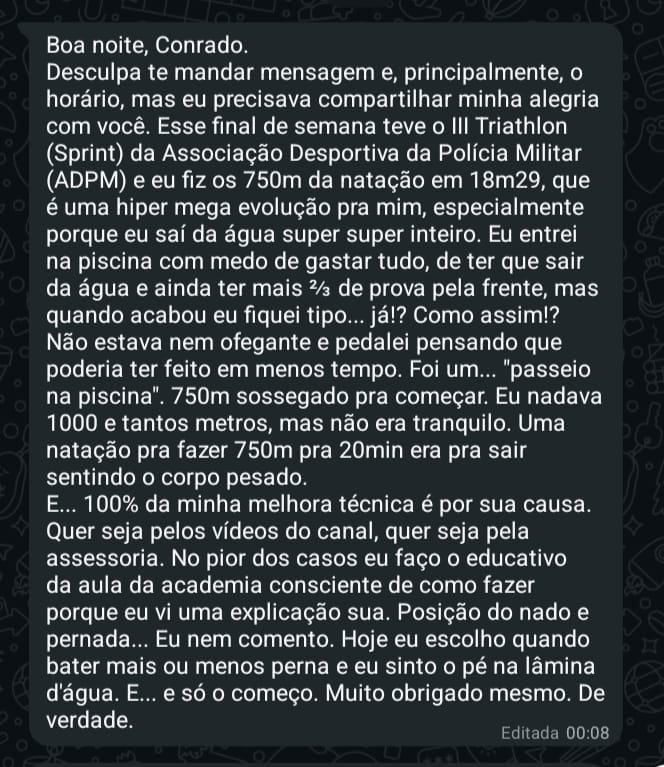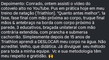 Dentro da Assessoria em grupo temos a comunidade Swim Club que você pode estar tirando suas dúvidas com outros nadadores e com o próprio Conrado, além de você ter a oportunidade de participar dos plantões de dúvidas que acontecem mensalmente.
